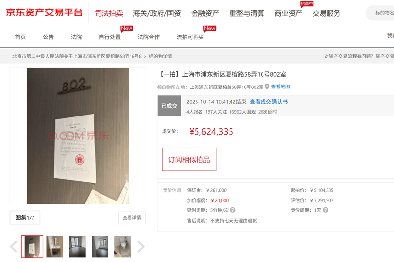 以上海10月14日刚成交的浦东新区夏榕路58弄的66套住宅房源为例,京东资产交易平台显示,浦东新区夏榕路58弄16号802室起拍价510.4万,单价约为4.96万元/平方米,最终成交价约为562.4万,成交单价约为5.46万元/平方米,而评估价约为729.2万,对应单价约为7.08万/平方米,按此计算,相当于打了7.7折,而周边同地段新房的售价单价也已经超过8万/平方米。